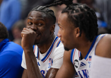 Flory Bidunga and Darryn Peterson after KU’s win over Baylor