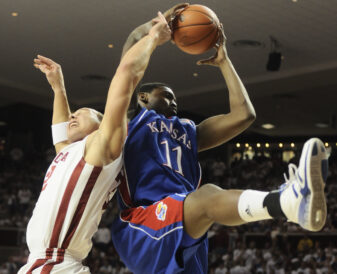 OU trimmed the lead to three twice, but both times KU guard Sherron Collins answered with threes of his own.