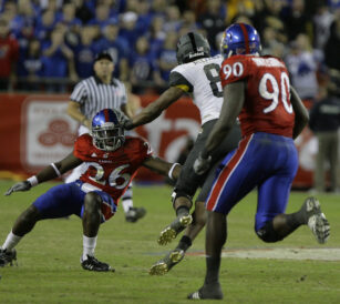 The team’s helmets also featured the Jayhawks logo, a change from the “KU” usually depicted.