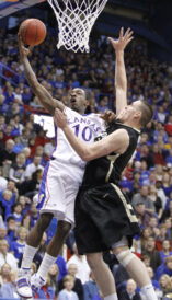 Perry Ellis, a 6-8 sophomore standout from Wichita Heights High, attended and sat behind KU’s bench. … Cole Aldrich (10 rebounds) moved into 12th place on KU’s all-time rebound list (779). … Aldrich (five blocks) became the first Jayhawk to block more than 100 shots in a season. He has 103. … KU’s 94 points were most in the last 18 games … KU’s plus-15 rebounding margin (40-25) was its third-biggest this season (30 vs. Alcorn State and 28 vs. Missouri).