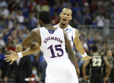 Teammate Elijah Johnson thrust his hands high in the air, celebrating with fans who were dancing in the aisles of CenturyLink Center after the final horn sounded in KU’s 63-60 NCAA Midwest Regional victory over Purdue on Sunday.