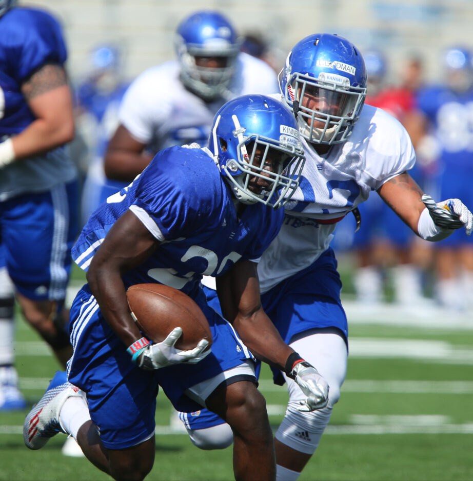 1. Ke’aun Kinner: Playing for Little Elm High in Texas, in one game he carried the ball 55 times and rushed for 332 yards and four touchdowns. Was on the radar of national powerhouses who waited to see if he would qualify academically before offering. He fell short and headed to Navarro (Texas) Junior College, where he averaged 1,918 rushing yards in two seasons and in 2014 was NJCAA Offensive Player of the Year. At 5-9 and maybe 180, he’s a small target who makes himself even more elusive by running with pads low to the ground. Extremely strong for his size, he impressed KU’s coaches with his vision and balance. Canadian Football League star Jon Cornish holds KU’s single-season record with 1,457 yards, an average of 121.4 yards per game. Might as well aim high.