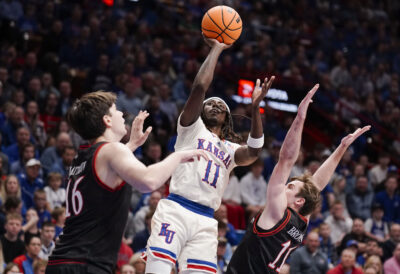Kansas guard Jamari McDowell (11) cuts between Davidson forward Ian Platteeuw (16) and Davidson guard Sam Brown (11) for a bucket during the first half on Monday, Dec. 22, 2025 at Allen Fieldhouse. Photo by Nick Krug