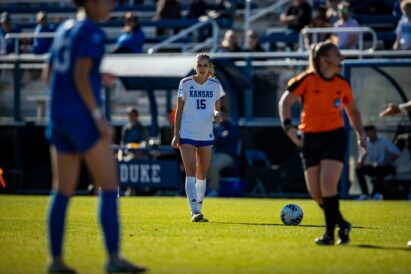 Kansas senior Lilly Meister passes the ball against Oral Roberts on Sunday, Nov. 23, 2025.